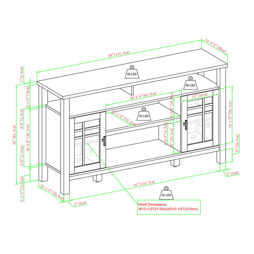 Simpli-HomeDIMENSIONS: 17"d x 60"w x 36"h Handcrafted with care using the finest quality solid wood and engineered wood Hand-finished with a Russet Brown Sta...