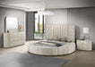 Embrace the art of retreat with a bedroom set that transforms luxury into an experience. Anchored by a grand round bed wrapped in plush velvet, the design features a sculpted scroll headboard with deep tufting and vertical channeling. Built-in USB-A and USB-C ports on both sides blend convenience into the romance, while hidden compartments beneath the upholstered base offer clever storage. Coordinating pieces mirror the softness and sparkle, with crystal hardware and sleek glass-topped silhouettes that complete the scene with quiet opulence.