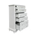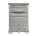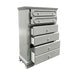 5 Drawers (Oversized Bottom Drawer with Double Handles) Drawer: Wooden Center Drawer Glide, Dovetail Included, Felt-Lined Top Drawer Hardware: Double Crystal like Knob (2 Top Drawer), Rossete Handle (3 Bottom Drawer) Wooden Construction Case-Frame: Bow Top Shape Wood Backet Legs Rossette Inlays Anti-Tipping KIT Included ASTM F2057 - 17 ASTM F3096 - 14 Compliant (YES)