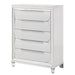 The Tarian chest will add stylish glamour with a refined touch of glitz to your bedroom! Sturdily crafted for long-term use, this bed is finished in a fresh and alluring pearl white. This piece offers five deep storage drawers to help keep your space organized and tidy. Mirrored-finished trim and elongated drawer pulls on the drawer fronts add captivating pizzazz. It stands on sturdy clear acrylic legs that make the bed appear as if it is floating.