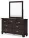 Feast your eyes on this richly versatile dresser with mirror. Its traditional-inspired dark brown finish effortlessly blends with contemporary bright nickel-tone pulls to create a stunning look that's not too stuffy or too trendy. Spacious drawers offer plenty of storage for your wardrobe and spare bed linens. The mirror is a handsome reflection of classic-meets-modern design.