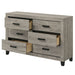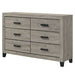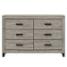 A fresh take on farmhouse design the Mari bedroom collection offers a sleek transitional design aesthetic. The bedroom set is finished in a stylish light gray with black accents that can appease anyone. The bed features a chevron-paneLED headboard and sits on black wooden legs. All the casegoods offer storage drawers with contrasting black metal pulls and sit on black wooden legs to match the bed. The dresser mirror is encased in a wooden frame to match the dresser.