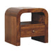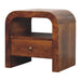 - Darcy Chestnut Nightstand with Drawer and open shelf - A seamless fusion of elegance and practicality, this bedside table is handcrafted from 100% Solid Mango Wood in a rich chestnut finish. Featuring a gracefully curved design, it exudes a modern yet timeless appeal. The single drawer, adorned with a brass knob, offers discreet storage, while the open shelf provides additional space for books or essentials. Perfect for adding warmth and sophistication to any bedroom or living space, this sustainable and durable piece highlights expert craftsmanship, making it a refined and functional addition to your home.