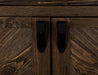 - Lightly distressed wood with a brown multi-step lacquer finish.