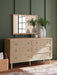 Clean-lined and contemporary—but far from stark—this dresser with mirror is a fresh style awakening. Pairing a light finish with replicated oak grain and textured beige details that replicate the look of cane, its mixed materials bring a naturally versatile vibe to your bedroom. Prepare to have your mind blown by the vast universe of possibilities that await within the spacious drawers. Whether you're prepping for work or getting ready to hit the town, the mirror will have you looking fabulous from every angle.