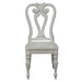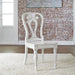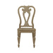 Sit in comfort with the Magnolia Manor splat back side chair. Crafted of rubberwood solids,, this piece features the perfect blend of European design, saddle shaped seat, dog bone accents on the splat back, nylon chair glides, and beautifully turned legs. Warm antique finishes and artistic distressing along with grand scale create a piece to be passed to generations.