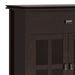 - Transitional Style includes clean angle edged table top, mullion framed tempered glass doors, rectangular antique bronze knobs and square legs
