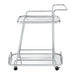 Grab the attention of your guests with a movable feast. This serving cart features two tier shelf that allow you to set drinks and snacks on top. It is founded atop a clean-lined metal frame, with clear glass and chrome finish that showcase a streamlined, modern aesthetic. There are also side rails and wheel stop included for safe and secure storage for your fragile glassware and wine collection.