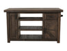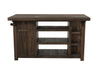 2 Drawer, 1 Door, Kitchen Island. The Dutton Kitchen Island is a masterpiece of country cottage style, symbolizing stability and rootedness in an ever-changing world. Designed with both style and utility in mind, it features two drawers and a door. One drawer is thoughtfully divided into multiple levels for efficient and accessible storage. This clever design enhances functionality while maintaining an organized space. In addition, the island boasts open shelves, providing ample room for all your kitchen essentials. The design incorporates a hand-wrought iron towel hanger rod to complete its practical and rustic appeal, blending functionality with a touch of artisanal craftsmanship. This piece is a perfect marriage of elegance and everyday utility. The visible wood grain and natural knots add texture and authenticity to the island. Finished in a rich brown stain, it highlights the wood's beauty while enhancing its rustic and timeless appeal. This design ensures stability while maintaining a refined, country-inspired aesthetic.