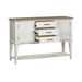 Summerville is a combination of style and function. The 48" square table features a storage pedestal base with two shelves. Combine the table with modern sophisticated styled chairs with square backs upholstered in a white leather with button tufted accents and sloped arms