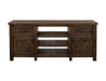 2 Drawer, 2 Door, TV Stand. The Dutton TV Stand is a masterpiece of country cottage style, symbolizing stability and rootedness in an ever-changing world. The visible wood grain and natural knots add texture and authenticity to the piece. Finished in a rich brown stain, it showcases the beauty of the wood while enhancing its rustic and timeless appeal. Designed with both style and functionality in mind, it features two drawers, two doors, and two fixed shelves. This clever design enhances functionality while maintaining a well-organized space. Furthermore, this design ensures stability while presenting a refined, country-inspired aesthetic. Combining it with the Pier will create a stunning wall unit that you'll love!