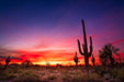 Immerse yourself in the captivating beauty of the desert at sunset with "Desert Dreamscape." This stunning wall art features a vibrant photograph of towering cacti silhouetted against a fiery sky that transitions from deep reds and oranges to soft purples and blues. Printed beneath durable tempered glass and hand-embellished for a sleek, dimensional finish, this piece brings warmth and tranquility to any living room, office, or bedroom. Ready to hang with sawtooth hangers, it combines safety, strength, and elegance while supporting a meaningful cause—each purchase donates a meal to a hungry child in America.