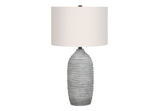 8th StreetModern Design: Vase-like shape with textured grey resin body, flowing lines, and an ivory linen drum shade, topped with a black round finial. ...