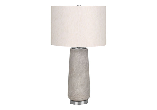 8th StreetModern Design: Features a subtly textured grey resin cylinder base with polished silver metal footing and an ivory linen drum shade topped with...