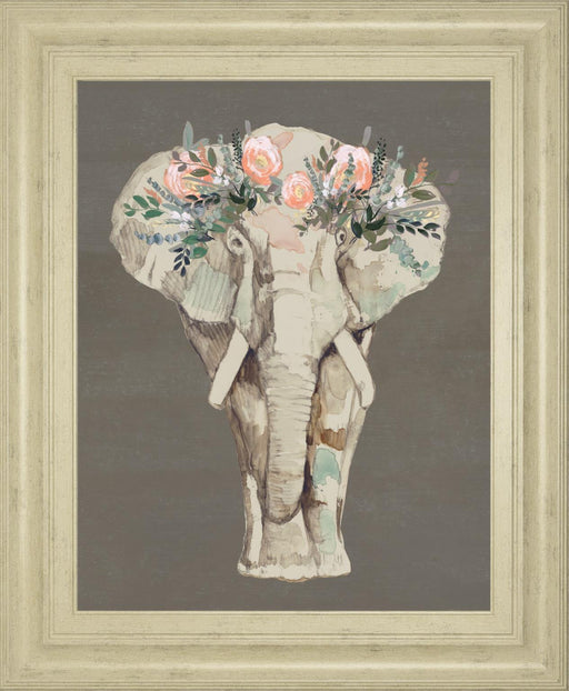 Classy LivingThis enchanting artwork captures the gentle majesty of an elephant adorned with a delicate crown of pastel flowers. The muted earth tones of the el...