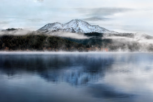 Classy LivingExperience the serene beauty of a misty mountain lake captured in this stunning tempered glass wall art. The photograph showcases snow-capped peaks...