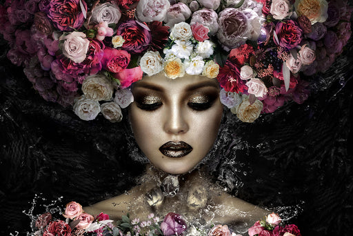 Classy LivingThis striking "Woman Gold Hair Rhinestones" wall art piece captures a powerful portrait of a woman adorned with shimmering gold rhinestones and met...