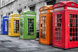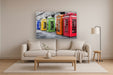 Brighten your space with "Phone Booths in Color," a striking photographic wall art piece printed on durable tempered glass. Featuring a vibrant lineup of classic phone booths in bold primary colors against a muted cityscape, this contemporary artwork adds a playful yet sophisticated touch to any living room, office, or hallway. The hand-embellished finish beneath tempered glass creates a sleek, dimensional shine that enhances the vivid hues and sharp details. Ready to hang with sawtooth hangers, it offers effortless installation and a clean, frameless look. Each purchase supports a meaningful cause by donating a meal to a hungry American child, making this piece both beautiful and impactful.