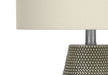 - Design & Style: Contemporary 24" table lamp with a grey resin base featuring a raised, dotted texture and an ivory fabric drum shade for a boho-glam look.