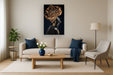This striking hand-painted gloss canvas titled “Gold Headdress Portrait on Black” captures a powerful profile of a woman adorned with an intricately patterned gold and brown headdress. The high-gloss finish enhances the rich textures and deep contrasts, making the gold accents shimmer against the black background. Hand-applied embellishments add depth and a unique tactile quality to this contemporary piece, perfect for adding sophistication and cultural elegance to living rooms, bedrooms, or offices. Ready to display with professional mounting hardware, it offers a bold statement of beauty and artistry.