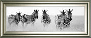 Zebra Gathering invites you into a quiet moment on the plains where five zebras stand poised amidst tall grasses, their striking black and white stripes creating a captivating contrast against a soft, misty backdrop. This contemporary photographic print, framed in a sleek silver MDF frame with crystal-clear glass, brings a serene touch of the wild into your living room, office, or bedroom. Expertly crafted in the USA, it adds both natural elegance and a sophisticated focal point to your space, encouraging a peaceful connection with nature's subtle beauty.