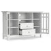 • Transitional design includes molded table top, beaded drawer fronts and sides,lightly tapered legs, tempered glass doors with cross hatch style mullions and brushed nickel hardware