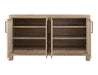 4 Door, Console. Bring warmth and character to your home with the Solara Console, expertly handcrafted from solid Melina wood and finished in a lacquer. The door panels are adorned with woven yucca fiber, and the base features CNC-machine textured, providing a touch of organic charm and elegance. It features two shelves for practical storage and custom metal pulls; the Solara seamlessly combines artistic details with functional design, crafted to be cherished for a lifetime.