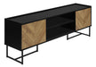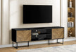 - Durable Design: This 72-inch TV stand features a contemporary brown and black laminate finish paired with a sturdy black metal frame, enhanced by V groove lines on the wood-look doors for a modern aesthetic appeal.