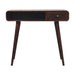 • Curved Writing Desk - Introducing our stylish Writing Desk, crafted from solid mango wood. It's sustainably sourced and comes in a beautiful finish. With one open slot and one drawer, it helps keep your space tidy. One shiny brass knob and and four Nordic-style legs add a touch of elegance. Perfect for work or study, this desk is a functional and attractive addition to your home or office.