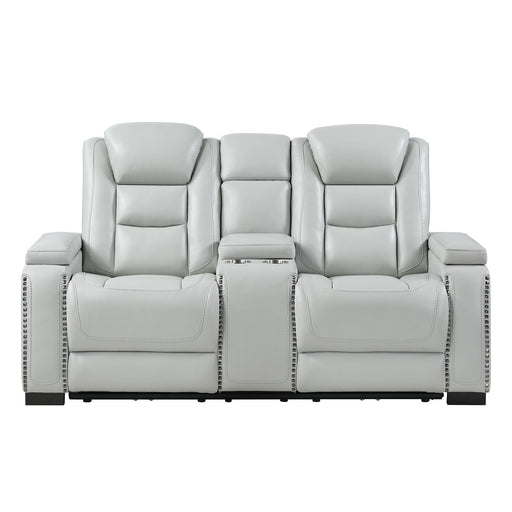 ACMEElonzo - Power Motion Loveseat With Console, LED, Power Headrest & Speaker - Light GrayProduct Features Seat Construction: Pocket Coil Wooden I...