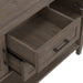 - Transitional design includes shaker style doors featuring X detail in panel, bronze pulls and square tapered legs
