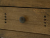 The brown translucent multi-step lacquer allows the natural grain of the Parota wood to shine through beautifully. The drawer fronts are decorated with nails arranged in two vertical lines on either side of the knob handles.
