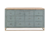 12 Drawer, Console. The Timber Console is a remarkable furniture piece that beautifully combines functionality with style. Designed to enhance any room, it features 12 spacious drawers, providing generous storage space for all your essentials while keeping your living area organized and clutter-free. Crafted from high-quality pine and poplar wood, the console showcases a rich, multi-step lacquer in an eye-catching green finish, accented by a hand-rubbed brown top that enhances the wood's natural beauty. The console is supported by a sleek, modern metal base in a sophisticated gold finish, adding a touch of luxury and elegance to its overall design. Whether used in a living room, hallway, or entryway, The Timber Console is not just a storage solution; it's a striking statement piece that elevates your home decor.