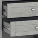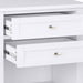 - Features two (2) spacious drawers, open bottom storage area, brushed nickel drawer pulls and metal drawer glides