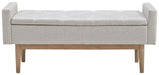 Contemporary style gets practical with this bench. The tufted beige seat cushion is hinged to allow easy access to whatever you need to hide in plain sight. Raised edges give the impression of arms, while the light brown finished wood legs help it blend with many different modern styles.