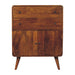 - Cabinet Curved Nordic Charm Artisan Furniture - Crafted from 100% Solid Mango Wood, this storage cabinet combines functionality with mid-century modern aesthetics. The warm Chestnut finish highlights the natural grain of the wood, adding timeless appeal. Featuring two compact drawers and a dual-door cabinet with two slots, it provides versatile storage for your essentials. Its clean lines, curved edges, brass knobs, and Nordic-style legs enhance its minimalist charm, making it perfect for bedrooms, living rooms, or home offices. This piece offers a stylish and durable solution for organizing your space with understated elegance.