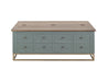 8 Drawers, Hinged Top Cocktail Table. The Timber Occasional Tables are remarkable furniture pieces that beautifully combine functionality and style. Designed to enhance your living room, these tables are crafted from high-quality pine and poplar wood and showcase a rich, multi-step lacquer in an eye-catching green finish. They are accented by a hand-rubbed brown top that enhances the wood's natural beauty. The cocktail coffee table offers deep storage beneath a hinged top and boasts eight drawers that glide smoothly on wood-on-wood slides, offering ample space for your essentials. Supported by a sleek gold metal base, the Timber Occasional Tables are an elegant and functional addition to any space.