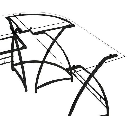 ACMECorner Computer Desk Orientation: "L" ShapeX-Shape Metal Frame BaseRectangular Table Top w/Tempered GlassKey Board Tray IncludedComputer Holder Inc...