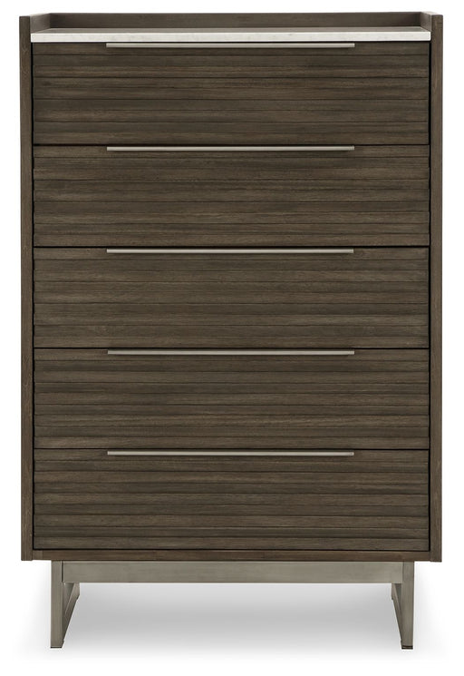 Ashley®Clean lines lend sophistication and structure to this chest of drawers. Its complex rich grayish brown finish contrasts perfectly with a white marb...