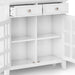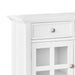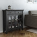 - Features two drawers for keys, gloves and other items and two tempered glass doors with interior storage and two adjustable shelves