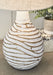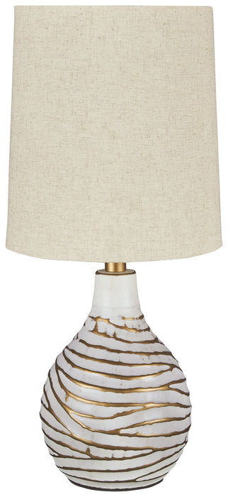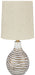 Shine a contemporary spotlight on your good taste with this table lamp. The antiqued white and goldtone finish of its base adds texture and interest to any space. With a modified drum shade, this light will illuminate your decor with style.