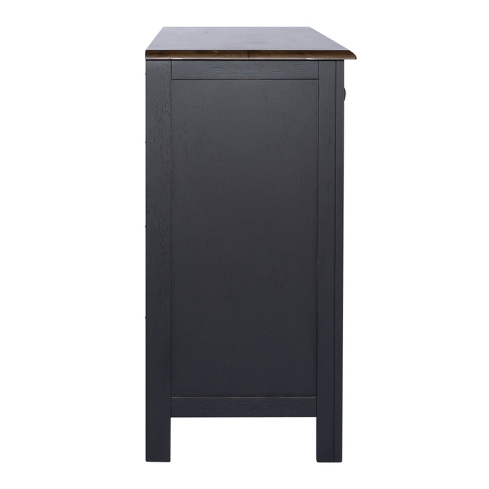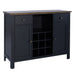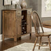 Enhance your space with the Carolina Crossing server. Crafted of rubberwood solids, this piece features a honey finish, bottom case dust proofing, two fully stained interior drawers, removeable nine bottle wine storage, two wood framed doors with one adjustable shelf behind each, and is accented by antique brass square knob hardware. This server is available in multiple finishes and the heavy distressing translates well into any decor.