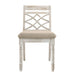 Timeless and charming, the Cillin side chairs lend a cottage chic vibe with an antique white finish frame and fabric-padded seats. Pair these chairs alongside French country decor in a rustic-style dining room to add some bright cheerfulness. These chairs have trumpet-style front legs and a visually appealing intriguing backrest design. The seats are upholstered in a plush fabric.