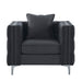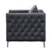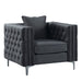 Wrapped in a luxurious velvet upholstery fabric the'Gillian II'chair is a great addition to any living space. The moody dark gray color adds a touch of mystery into any room and provides a contemporary look and feel. The button tufting and nailhead trim add some traditional design features, while the metal legs add a modern touch.