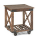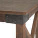 - Industrial, rustic design includes a sturdy frame featuring iron corner brackets with rivets
