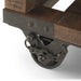 - Features spacious table top, slatted open bottom shelf, X detail on sides, unique iron wheels that offer mobility and can be easily locked into place