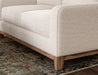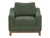 Wooden Frame & Base, Armchair. The Olivo collection seamlessly blends clean lines with a harmonious fusion of both organic and geometric shapes, offering unparalleled comfort for your space with its mid-century modern style, marked by subtle curves on padded armrests.