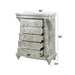 A luxurious antique silver finish with hand-brushed gold accents makes up the Sandoval chest. Surrounded by fine Rococo scrolls and floral ornament crowns with beautiful, stylized ribbons. Featuring five ample storage drawers that will keep clutter at bay. Decorate the tabletop with your favorite family heirlooms for a personalized touch.
