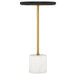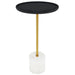- Features round solid mango wood top, antique brass look stem and solid white marble base