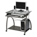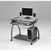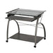 The Vincent computer desk offers an compact, sleek and contemporary design. This workstation is crafted in metal pewter finish with clear glass top. Features pull-out metal keyboard tray and bottom metal shelf.